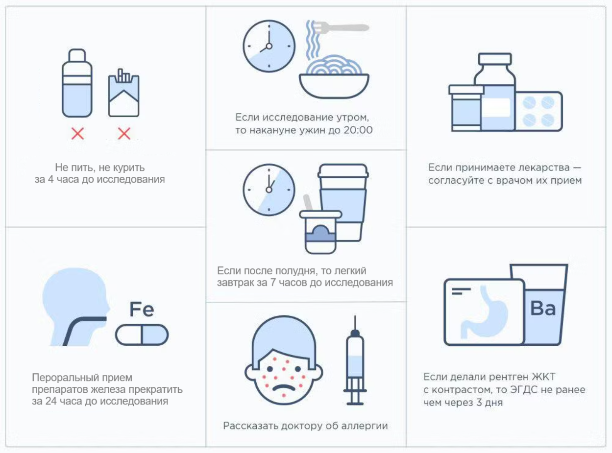 Если принимаете нижеперечисленные препараты - необходимо отменить за 24 часа до проведения гастроскопии: Антикоагулянты (препараты, влияющие на свертываемость крови): Ксарелто/Эликвич, Клопидогрел/Варфарин; Препараты железа, висмута (Денол); активированный уголь; обволакивающие препараты (антациды): Альмагель, Смекта, Гевискон, Маалокс и др.